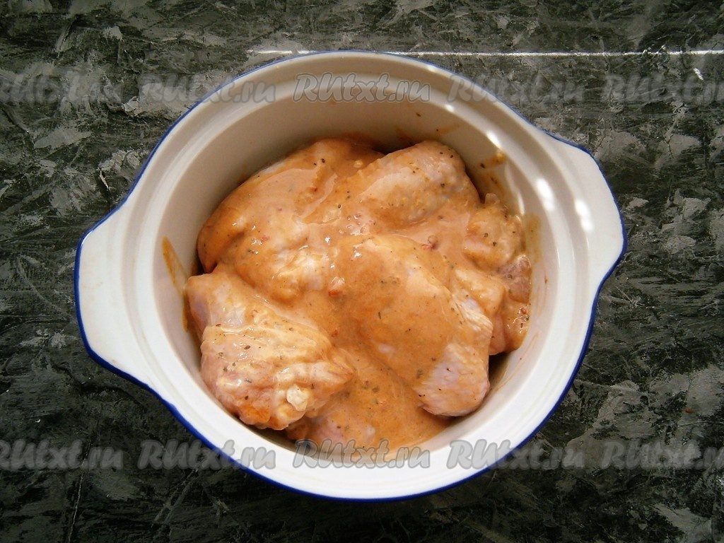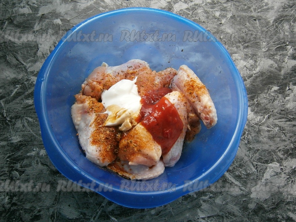 К крыльям добавить сметану, соевый соус и томатный соус.