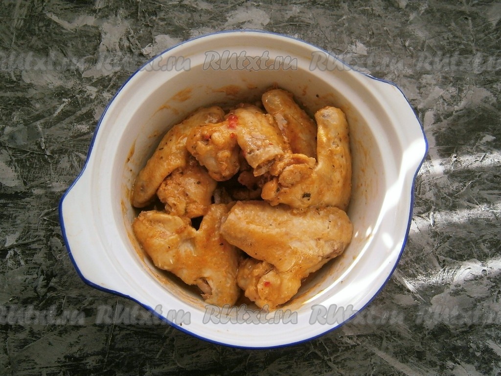 Хорошо крылья перемешать и оставить на 2 часа в прохладном месте. Выложить крылышки в посуду, предназначенную для СВЧ, добавить растительное масло, обязательно накрыть крышкой.