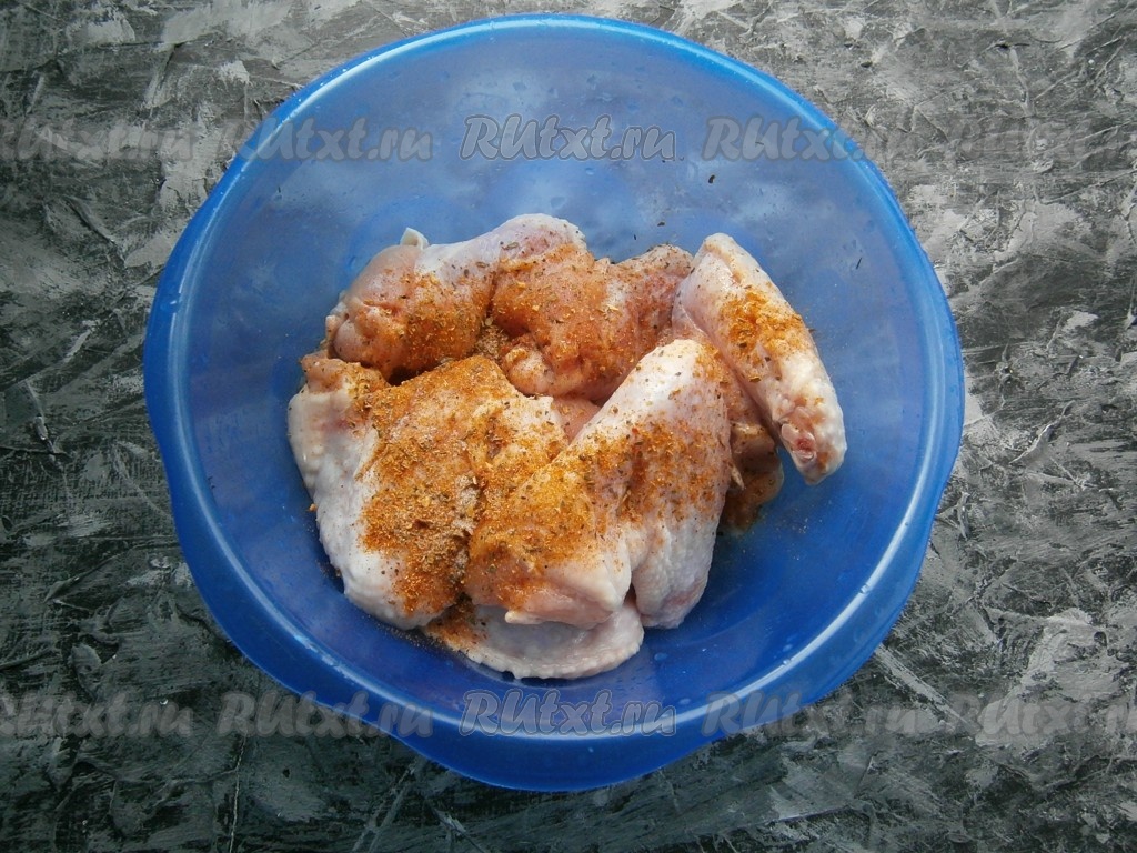 Куриные крылышки вымыть, по желанию, удалить кончики, обсушить, посыпать специями и солью (не пересолите крылья, в дальнейшем будет добавляться соевый соус, а он достаточно солёный).