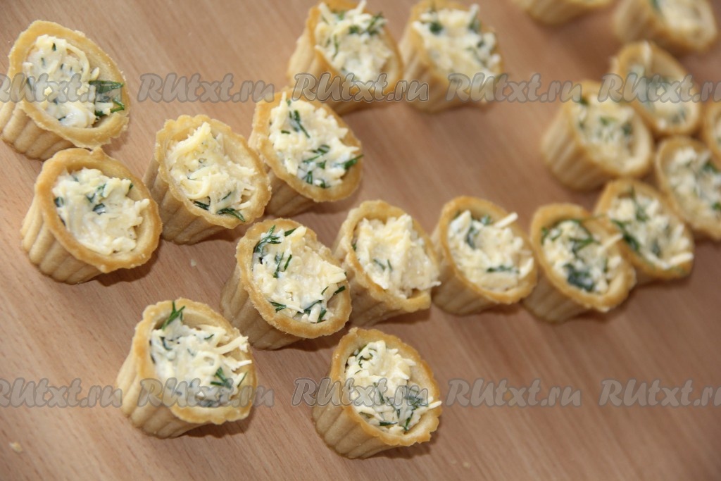 Наполнить тарталетки сырной начинкой.