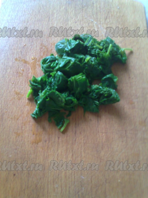 Листья шпината заливаем крутым кипятком, оставляем на пару минут, затем откидываем на дуршлаг, отжимаем и даем остыть.