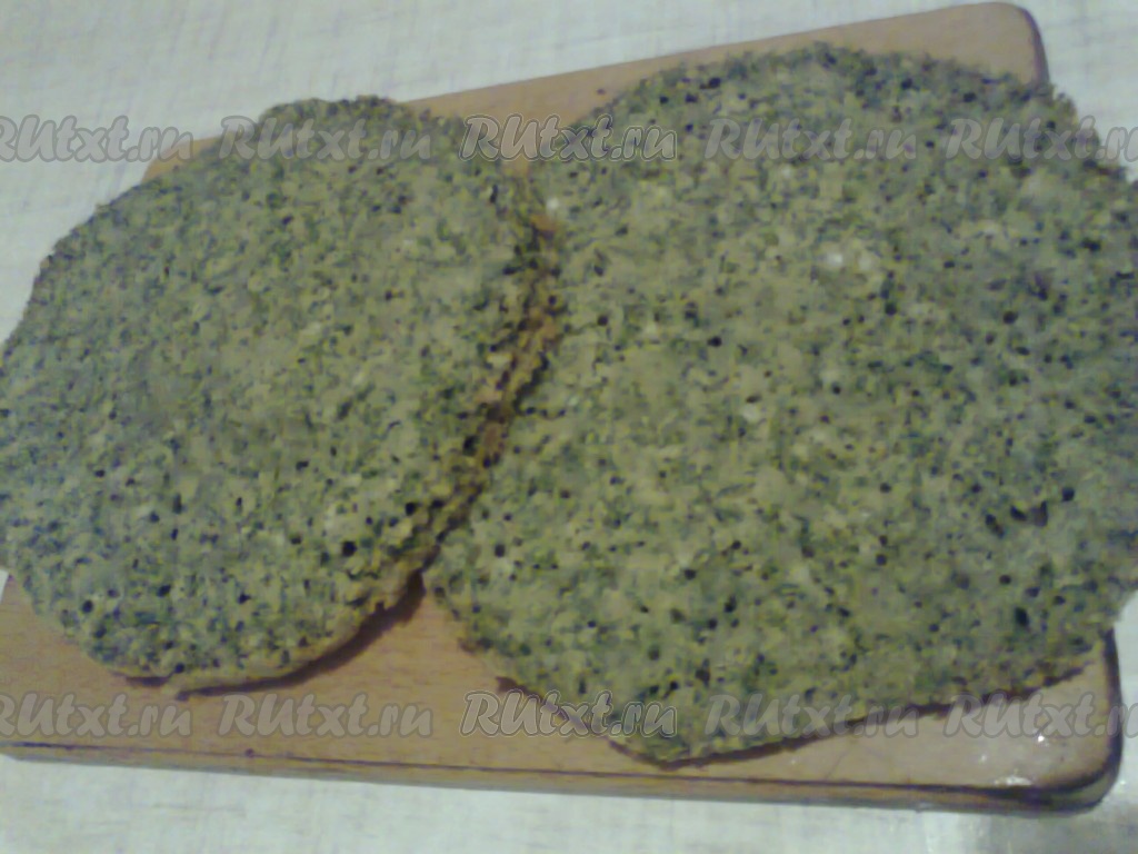 Готовый бисквит достаньте из духовки и дайте полностью остыть. После охлаждения разрежьте бисквит на 2 части, чтобы получилось 2 коржа.