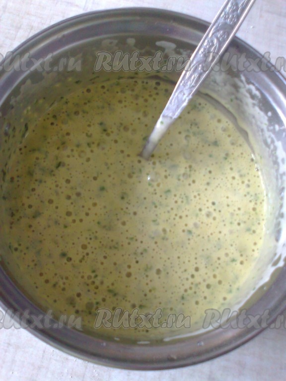 К взбитой яичной массе добавьте шпинатную массу, охлажденное растопленное сливочное масло, молоко, муку и соду, погашенную 1 чайной ложкой лимонного сока (или уксуса).