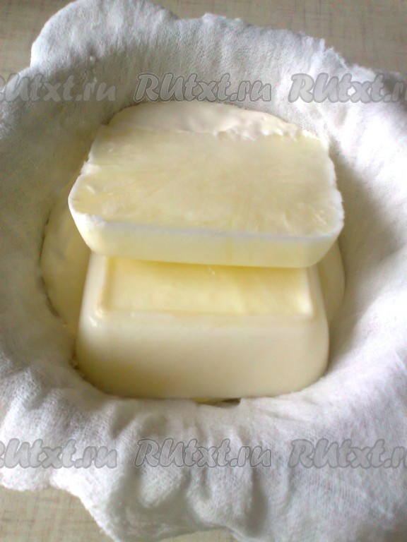 Для приготовления крема дуршлаг, застеленный марлей, сложенной в 2-3 слоя, устанавливаем в подходящую емкость для стекания сыворотки. Выливаем в него сметану и кладем замороженный кефир. Оставляем стекать в холодном месте на 8-12 часов.