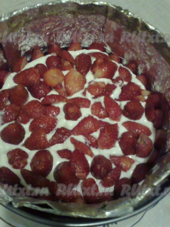 Заполните пустое пространство кремом, выложите целую клубнику, слегка вдавливая ее в крем. Промежутки заполните кусочками клубники.