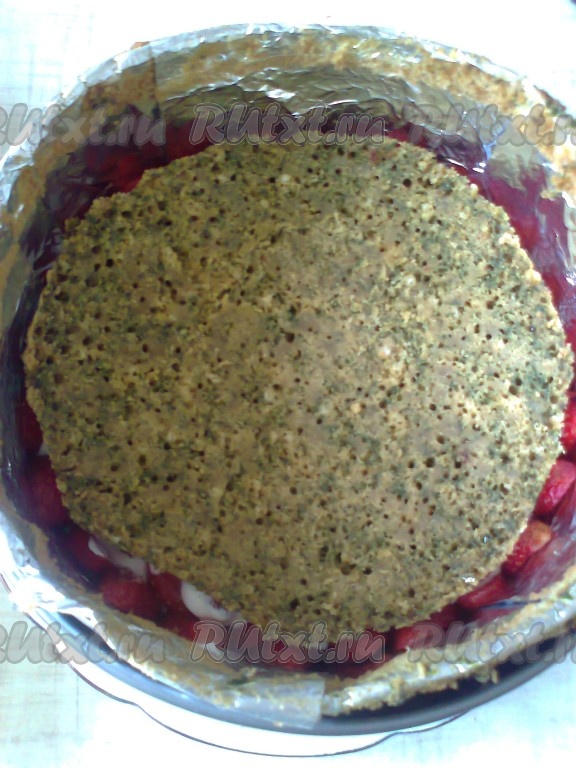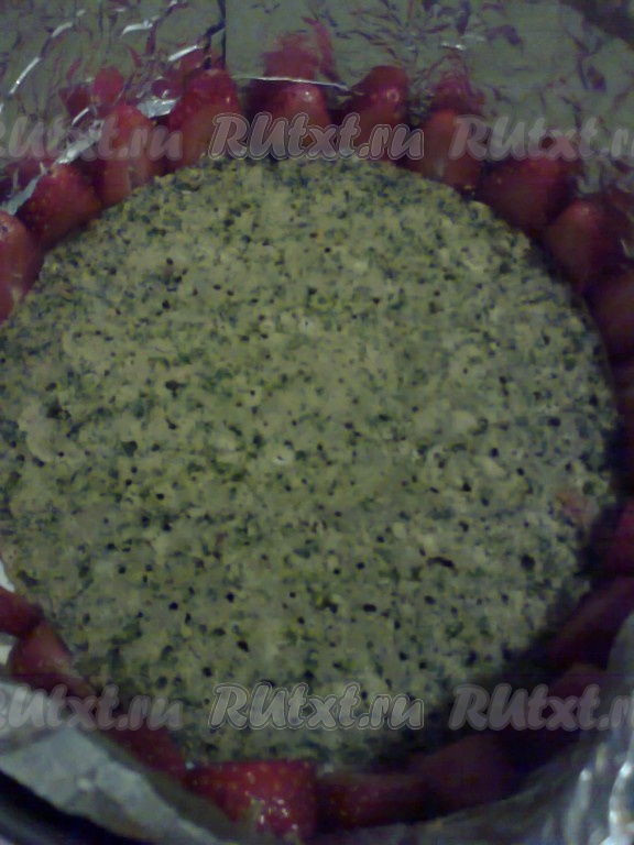 Если используете сливки, то взбейте сливки и сахар миксером, а затем добавьте холодный сливочный сыр и сгущенное молоко, перемешайте. Форму выстелите пищевой пленкой (у меня самодельная подложка). В форму поместите первый корж, по краю коржа поместите разрезанную пополам клубнику срезом к форме.