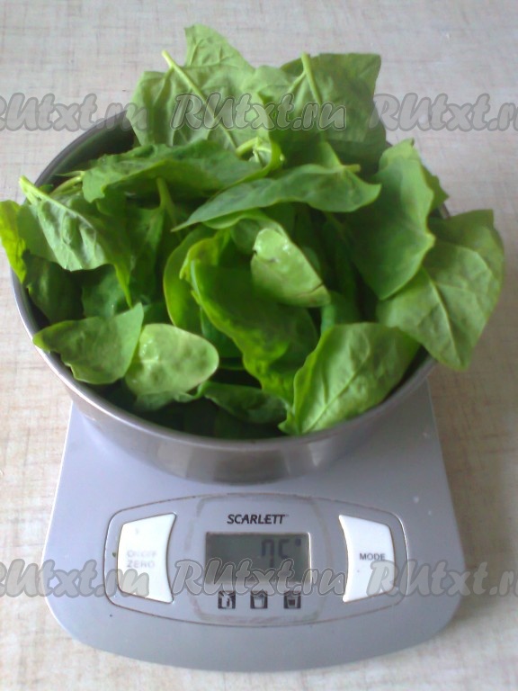 Затем надо подготовить шпинат. Если он замороженный, дайте ему полностью оттаять. Если шпинат свежий, то обрываем листки и промываем их.
