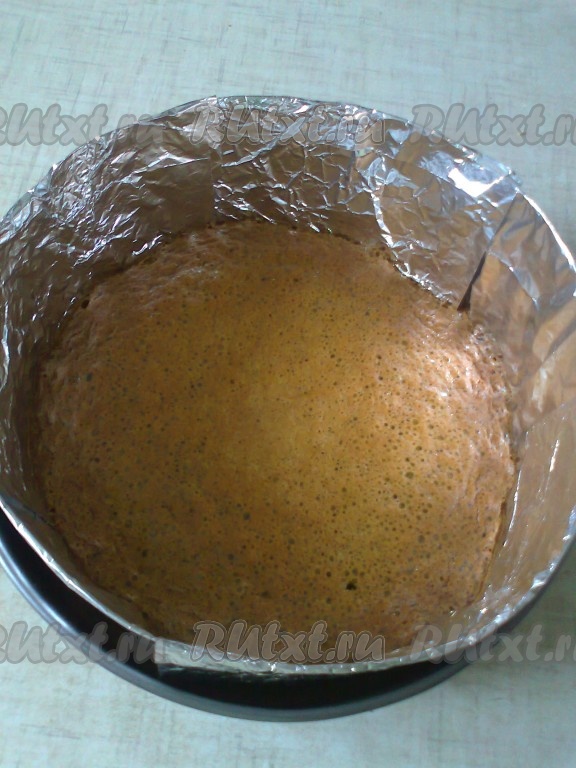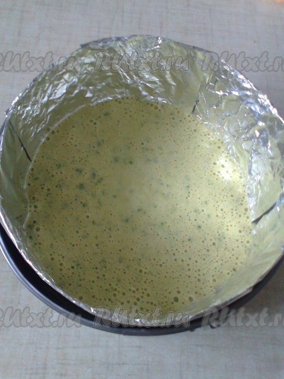 Перемешайте получившееся тесто и вылейте в форму диаметром 22,5 см (я проложила форму самодельной подложкой, сделанной из картона и фольги, но этого можно не делать).
