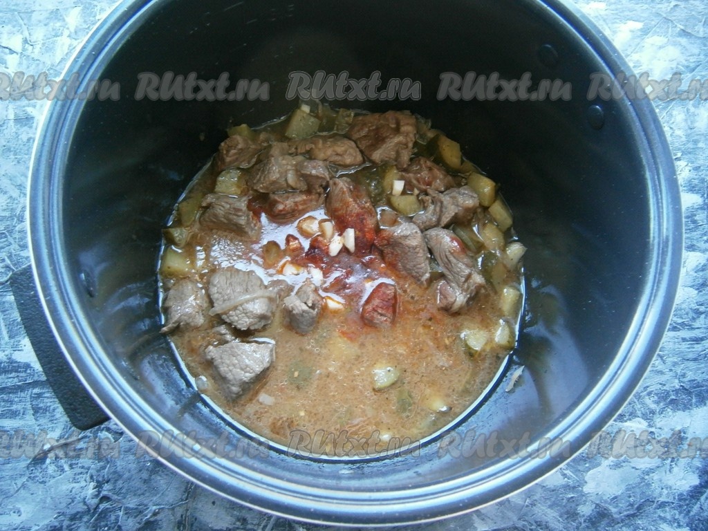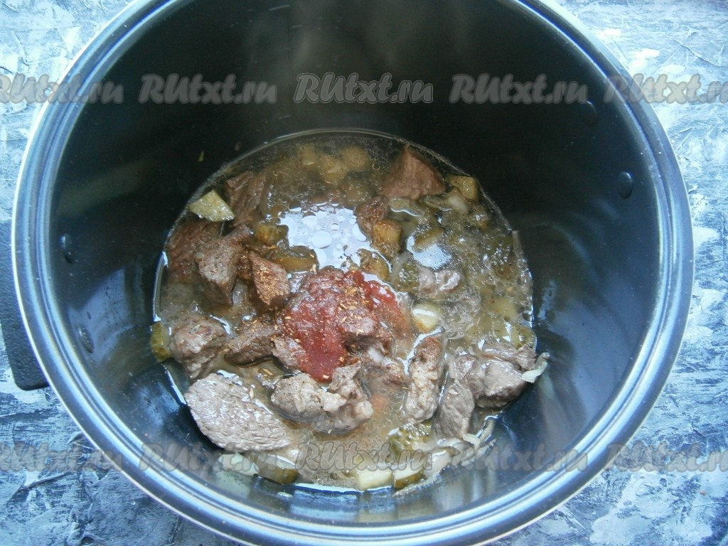 Также добавить нарезанные полукружочками соленые огурцы и обжаривать далее, иногда помешивая, до окончания программы. Затем влить горячую воду, добавить томатную пасту (или соус), всыпать соль, специи и черный молотый перец.