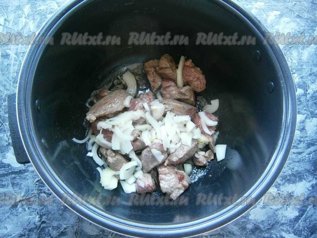В чашу мультиварки влить растительное масло, выставить программу "Жарка" на 20 минут. Поместить в чашу мясо, обжаривать, помешивая, 5 минут, после чего добавить нарезанный произвольно репчатый лук.
