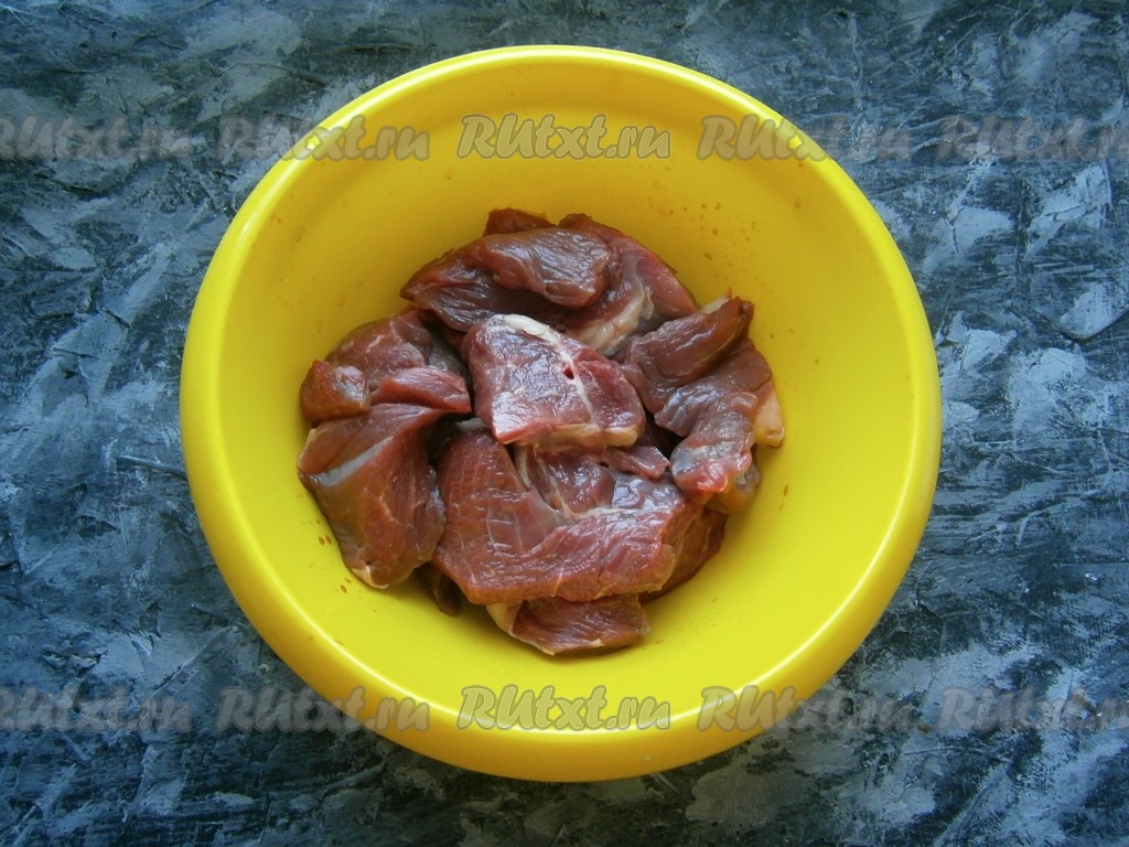 Говядину очистить от жира и пленок, нарезать средними кусочками.