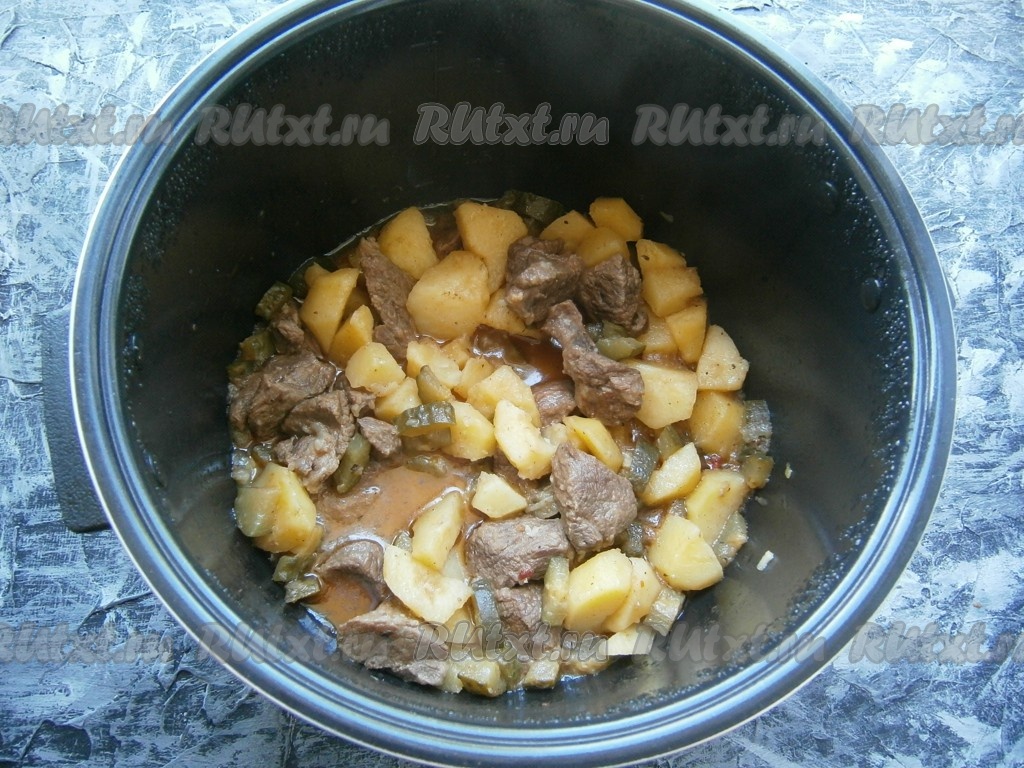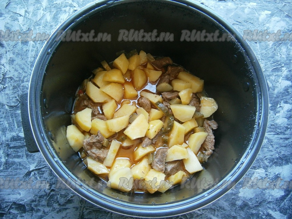 Закрыть крышку мультиварки, выставить программу "Тушение" на 1,5 часа. Через час добавить в чашу отваренный до полуготовности картофель, перемешать.