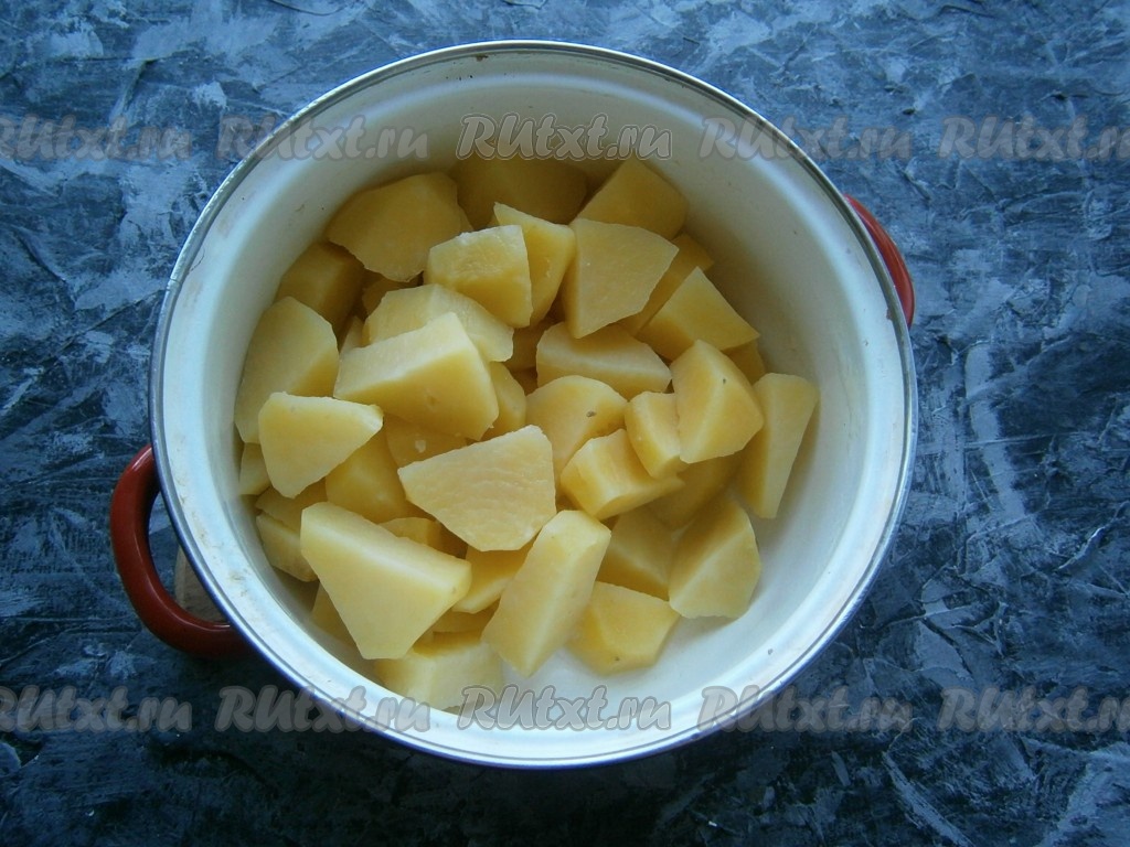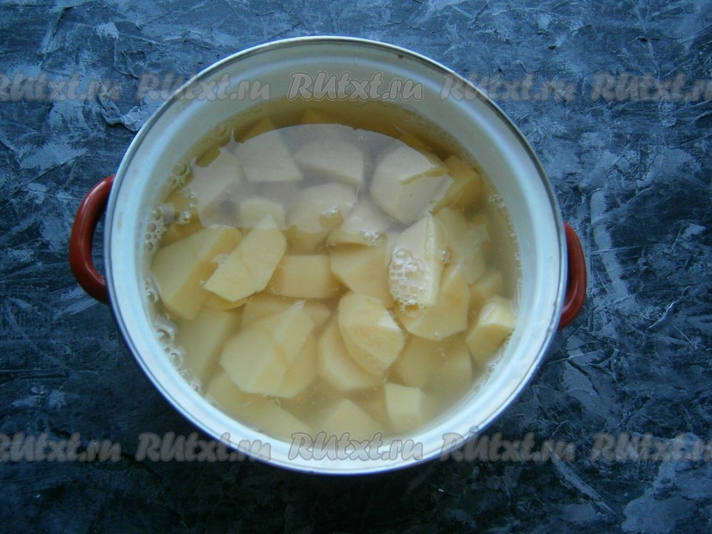 Отварить картофель, посолив по вкусу воду, до полуготовности (в течение 15 минут), затем воду слить.