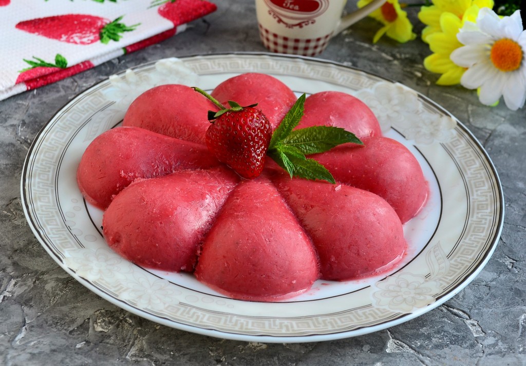 Далее миску со смесью клубники и сливок отправить в морозилку на 30 минут, затем снова взбить блендером. Снова поместить в морозилку на такое же время и снова взбить. Так поступать ещё 2-3 раза - смесь должна увеличиться немного в объёме. Перелить взбитую клубничную смесь в любую подходящую форму (лучше - в силиконовую). Если форма не силиконовая, тогда её нужно вначале застелить пищевой плёнкой, чтобы легче потом было вынуть мороженое. Из силиконовой формы оно извлекается без проблем. Если у вас есть порционные формочки для мороженого, то можно разложить в них.