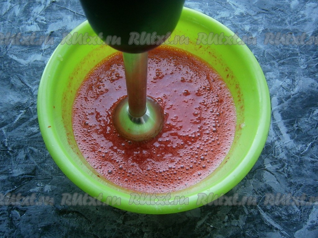 Клубнику с сахаром пюрировать погружным блендером до однородного состояния.
