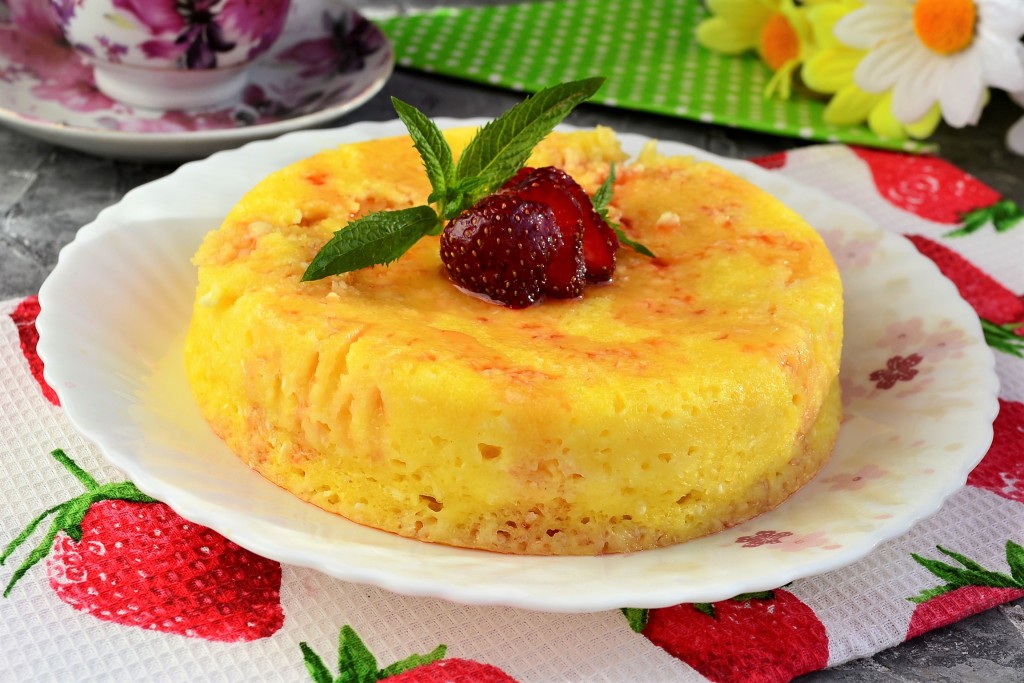 Дать замечательному, очень вкусному творожному кексу, приготовленному в микроволновке, остыть и подать его к столу.