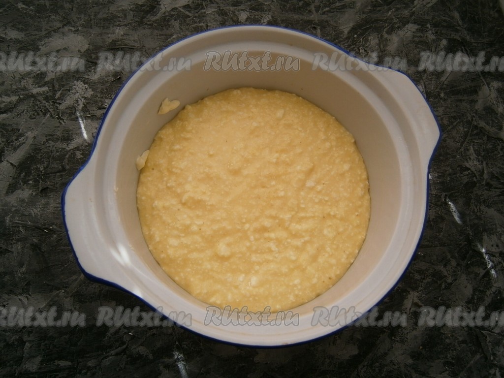 Форму (или кастрюльку), предназначенную для готовки в микроволновой печи, смазать сливочным маслом, выложить творожное тесто.