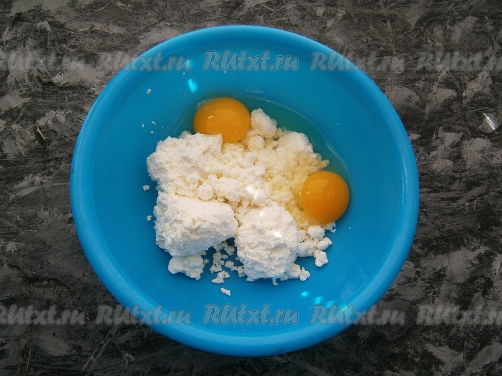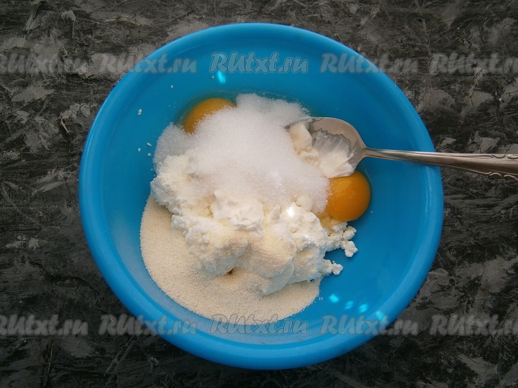 Сюда же всыпать манную крупу и сахар, добавить сметану.