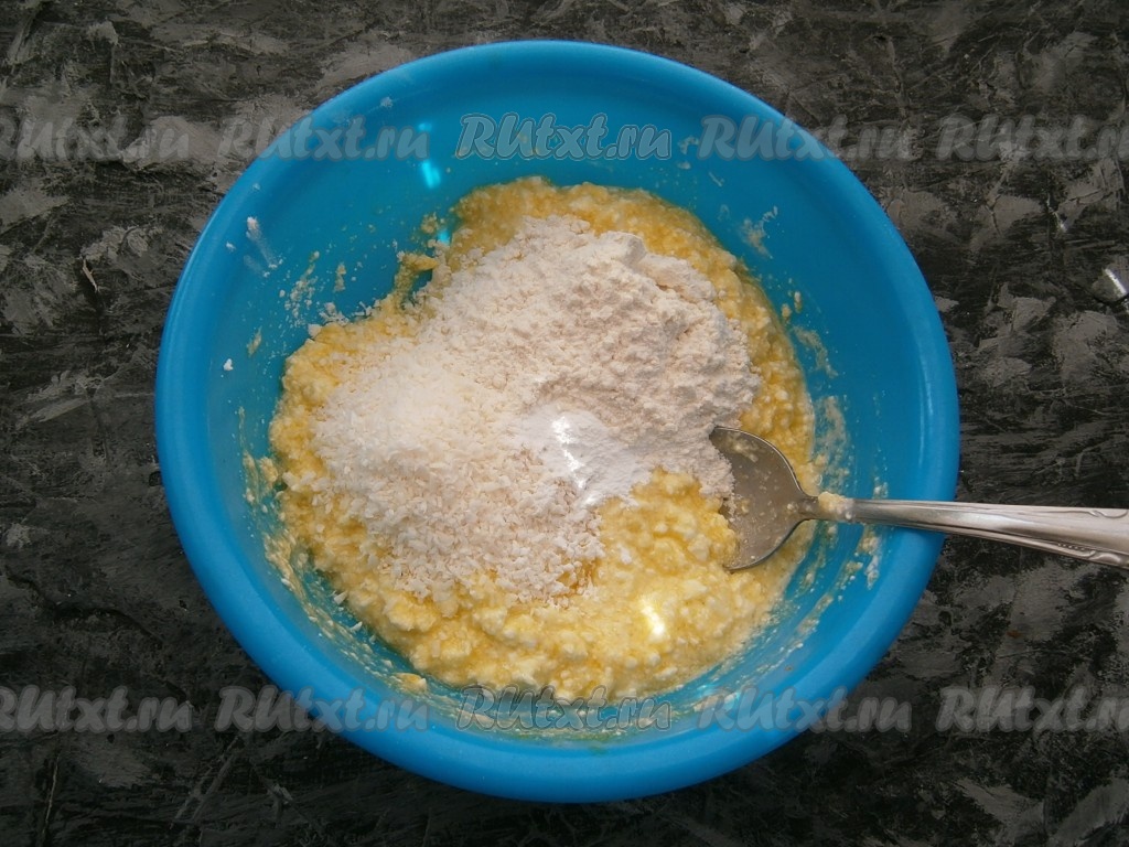 Тщательно перемешать и растереть, всыпать кокосовую стружку, разрыхлитель и муку. Если у вас нет кокосовой стружки, можно приготовить кекс и без нее.