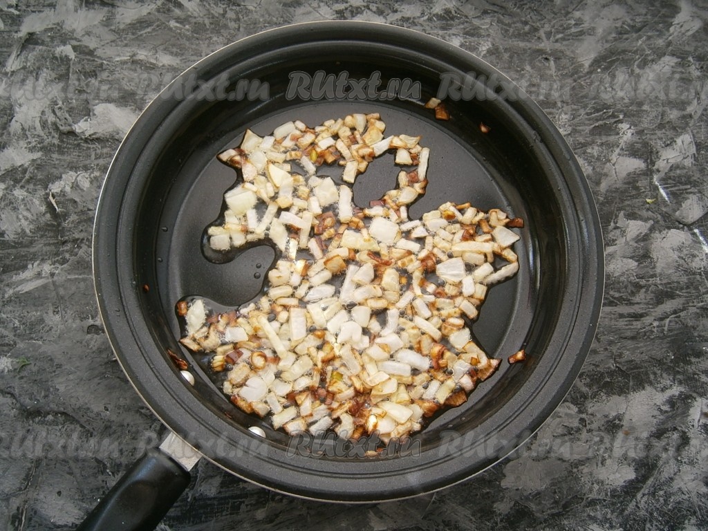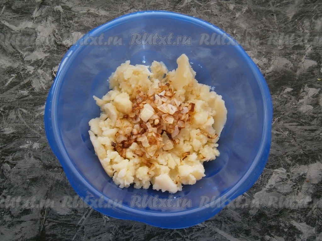 Картофель для приготовления зраз нужно очистить, отварить до готовности в подсоленной воде (в течение 25-30 минут), а затем слить воду, размять картошины толкушкой до однородности, остудить до тёплого состояния. Прекрасно подойдёт и толченая картошка, оставшаяся с обеда или ужина. Лук репчатый очистить, нарезать достаточно мелко, обжарить его, помешивая, до золотистости на растительном масле.