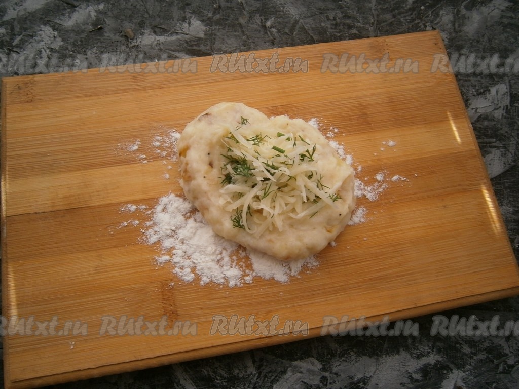 Из части картофельной массы сформировать лепешку, в середину которой поместить 1-2 чайных ложки смеси сыра и укропа. Сформировать зразу так, чтобы сырная начинка была внутри (зраза по форме должна напоминать продолговатую котлету), а края хорошо закреплены.