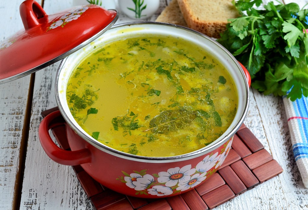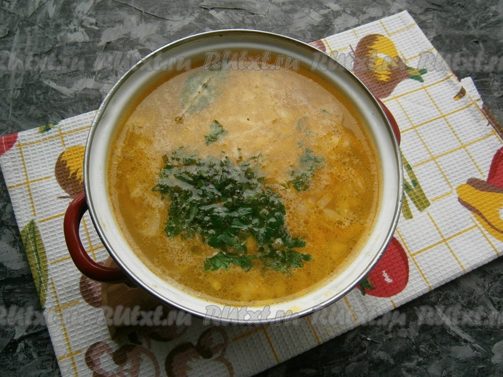 Затем добавить в кастрюлю измельченную зелень, перемешать, дать супу провариться еще 2-3 минуты, после чего выключить газ.