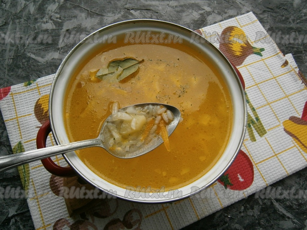 Аппетитный и очень вкусный рисовый суп, приготовленный без добавления мяса, можно подавать к столу.