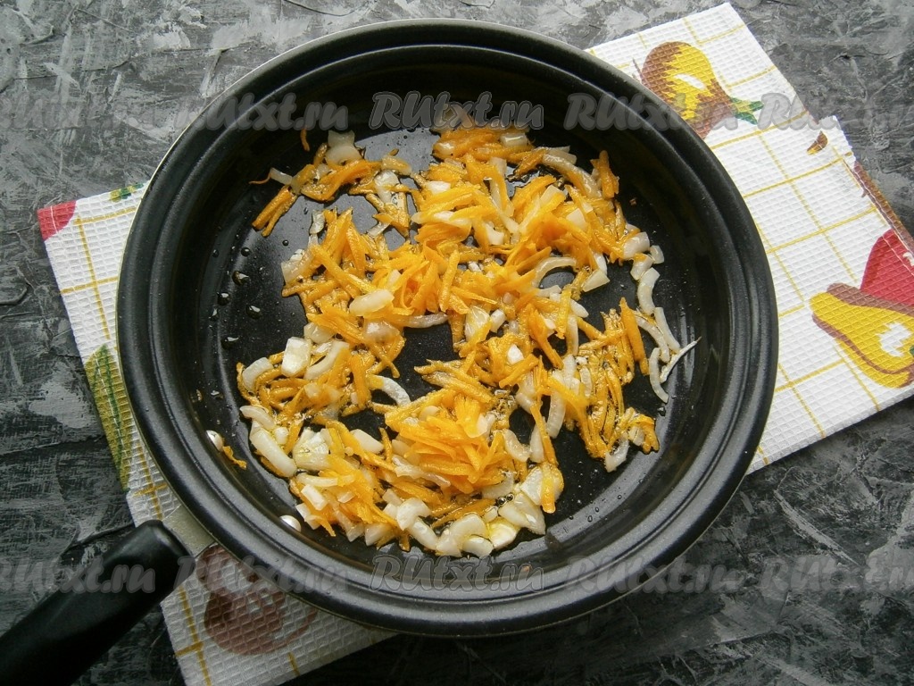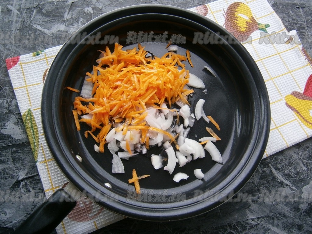 Лук нарезать достаточно мелко, морковь натереть и поместить в сковороду с растительным маслом.