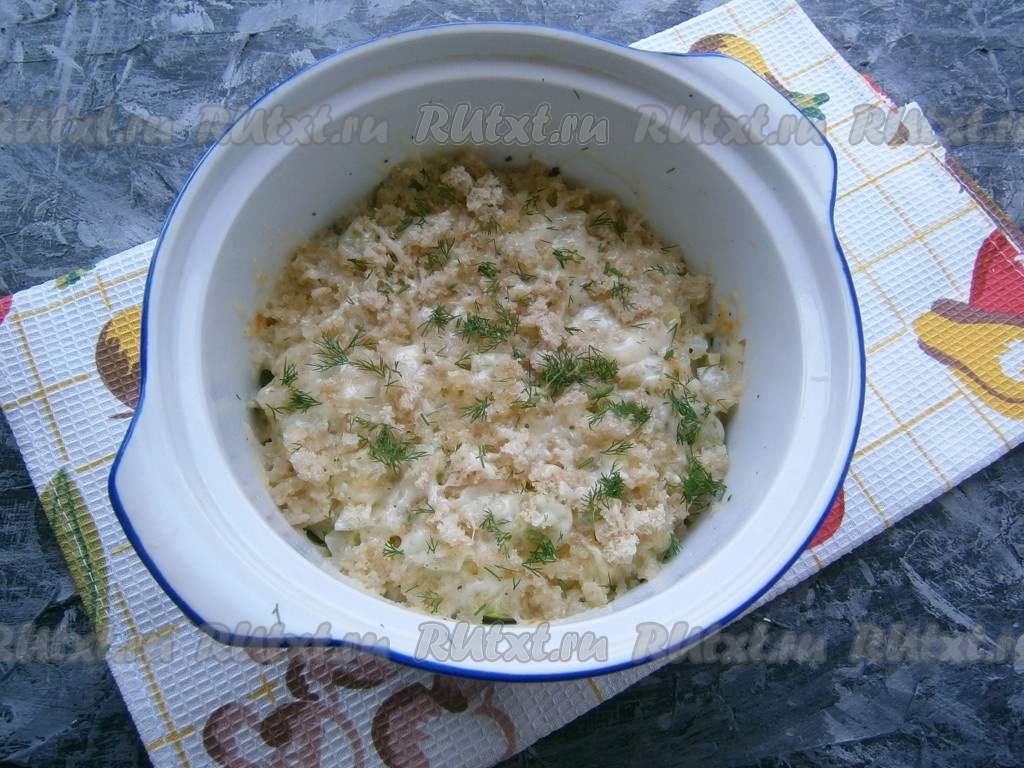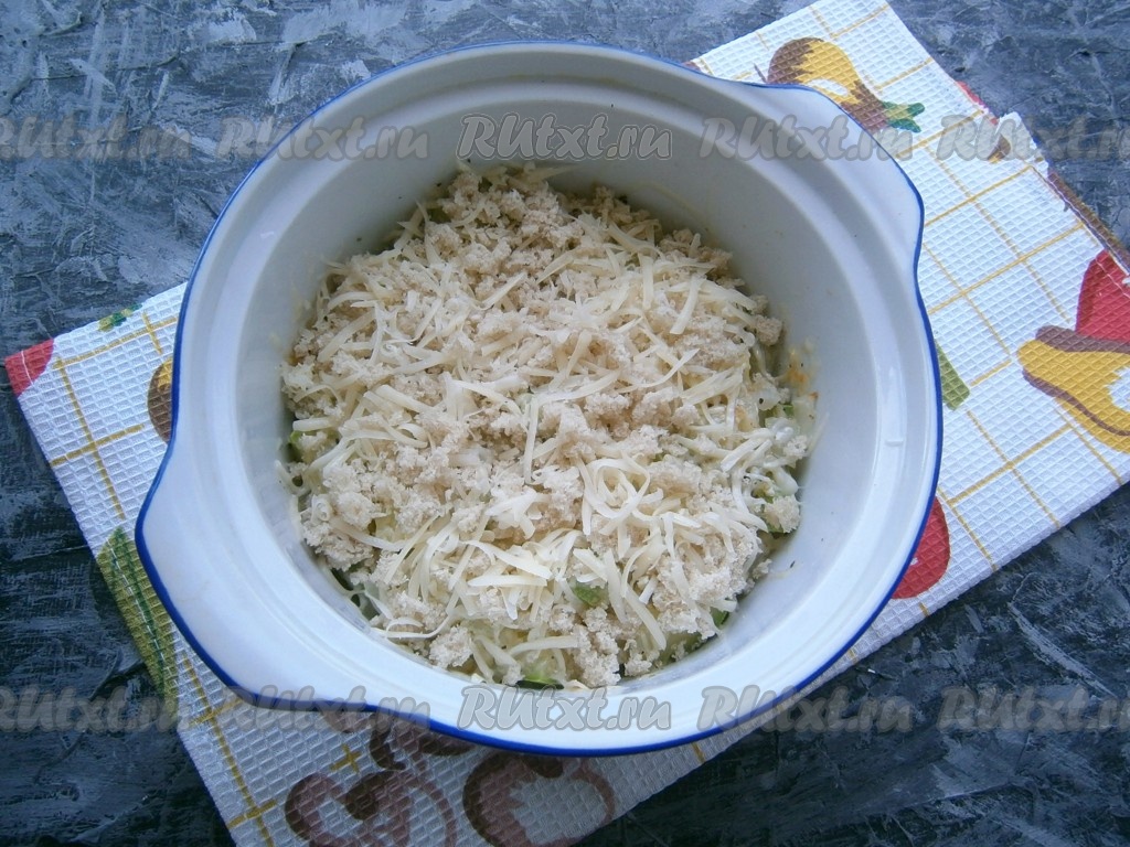 Смесь хлебных крошек и сыра высыпать поверх уже готовых кабачков и отправить в микроволновку при той же мощности еще на 2-3 минуты, но без крышки.