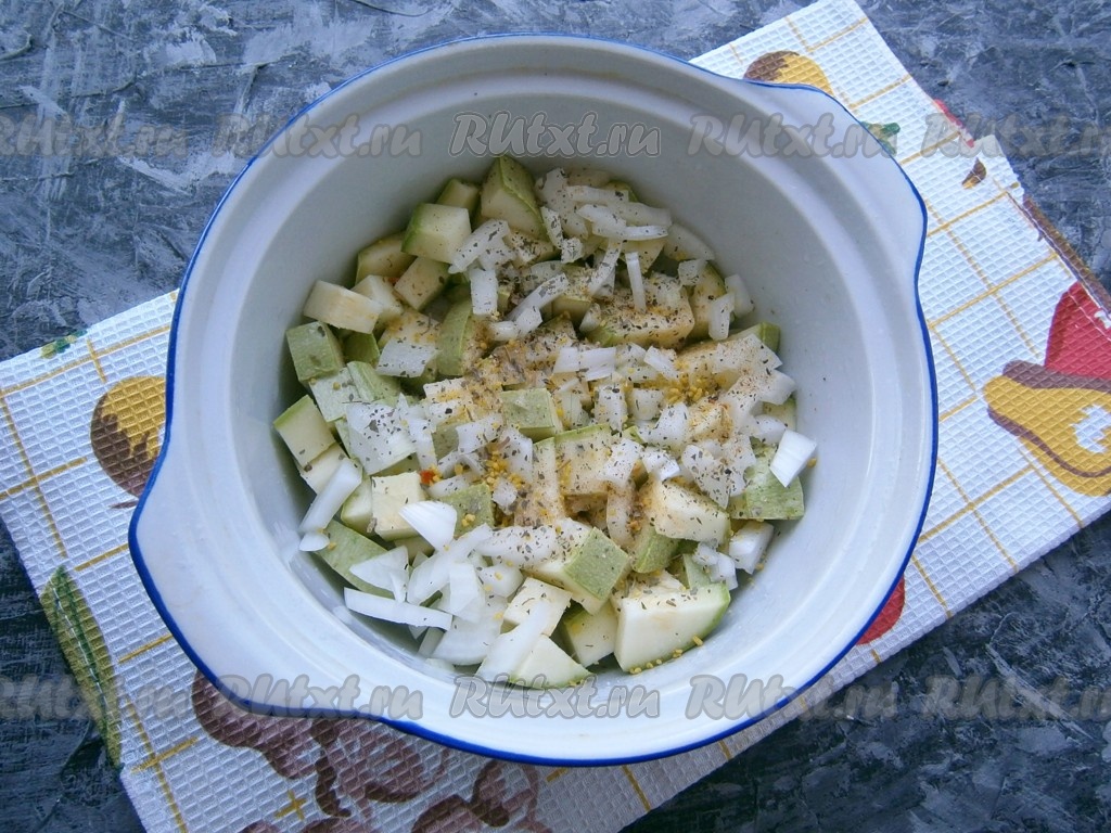 Выложить кабачки в кастрюльку (или форму), предназначенную для готовки в СВЧ, влить растительное масло и воду, посыпать мелко нарезанным луком, солью, перцем, специями и сушеным базиликом.