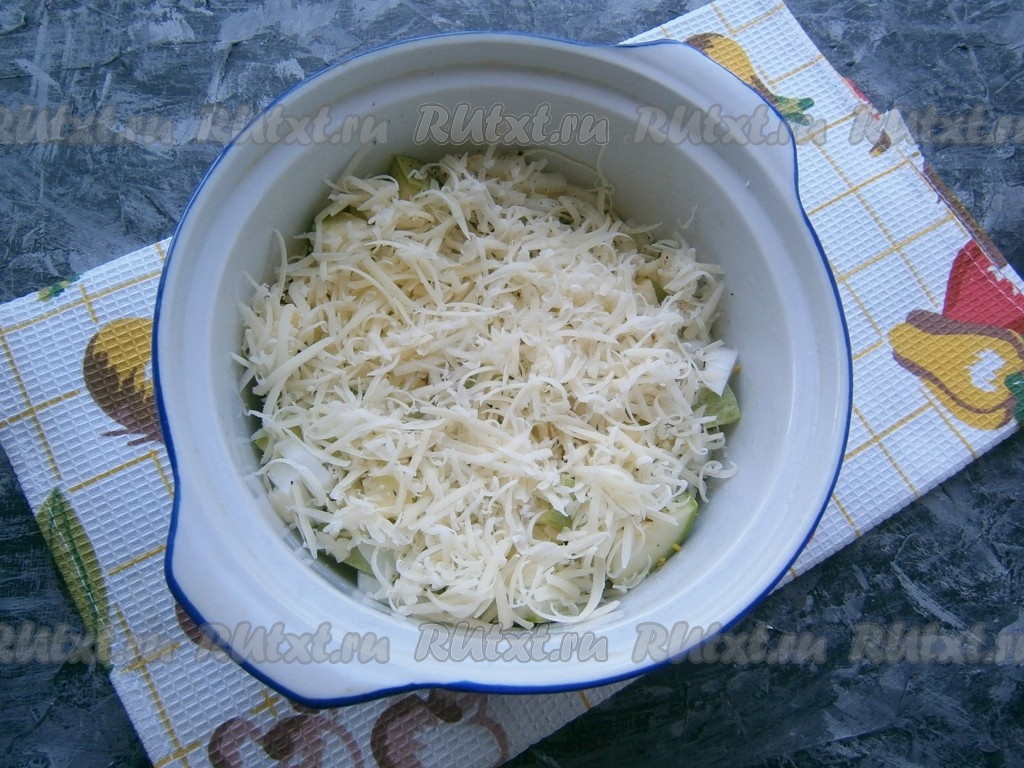 Сверху выложить 3 части натертого на мелкой (или средней) терке сыра. Кастрюльку с кабачками и сыром накрыть крышкой, но не полностью (или крышкой с отверстием для выхода пара) и отправить готовиться на 10 минут в микроволновку при мощности 700 Ватт.