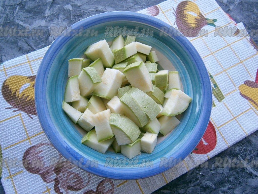Кабачок (если кабачок не очень молодой, его предварительно нужно очистить от кожуры и семян) нарезать средними кусочками (или кубиками).
