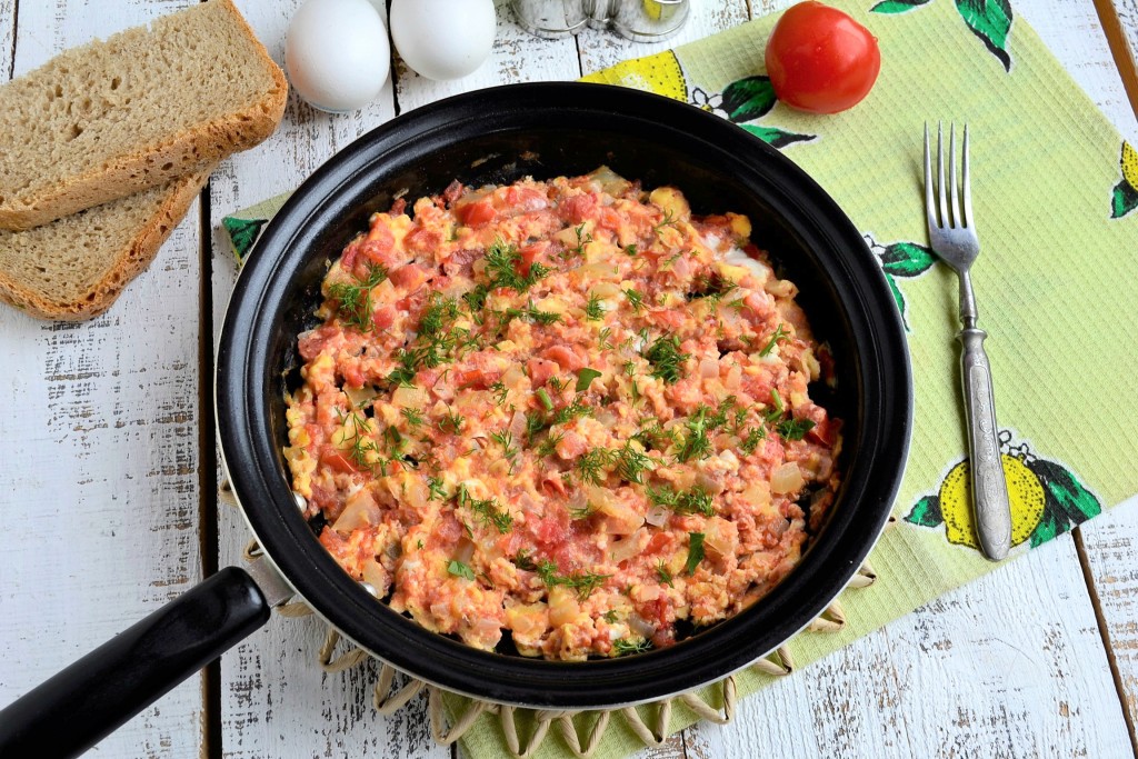 Жарить турецкий омлет на небольшом огне, перемешивая его каждые 3-5 секунд. Готовить буквально до тех пор, пока яйца не свернутся (2-3 минуты), затем огонь выключить, сковороду накрыть крышкой и оставить на 3-5 минут. За это время омлет с овощами дойдёт до готовности и не пересушится.