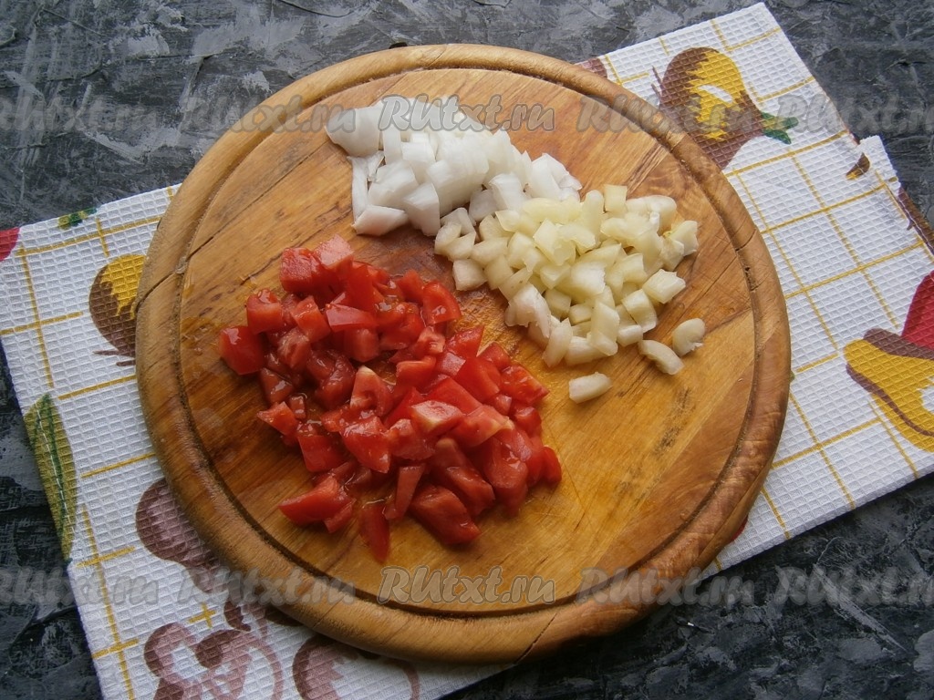 Лук очистить, из болгарского перца удалить семенную коробку. Помидоры, лук и болгарский перец нарезать небольшими кубиками (или кусочками).