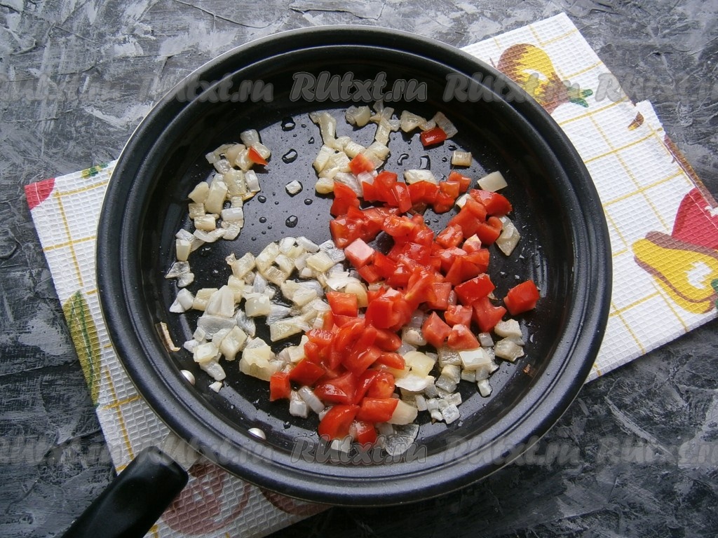 Когда лук и перец станут мягкими, добавить к ним нарезанные свежие помидоры.