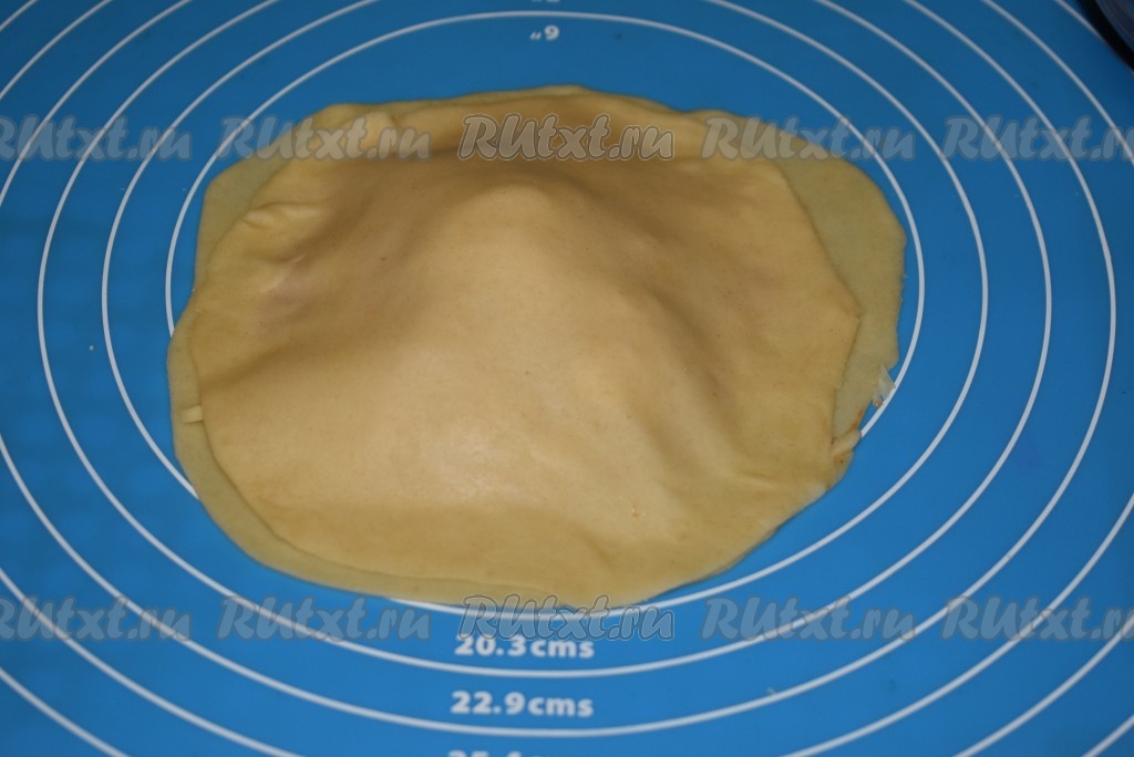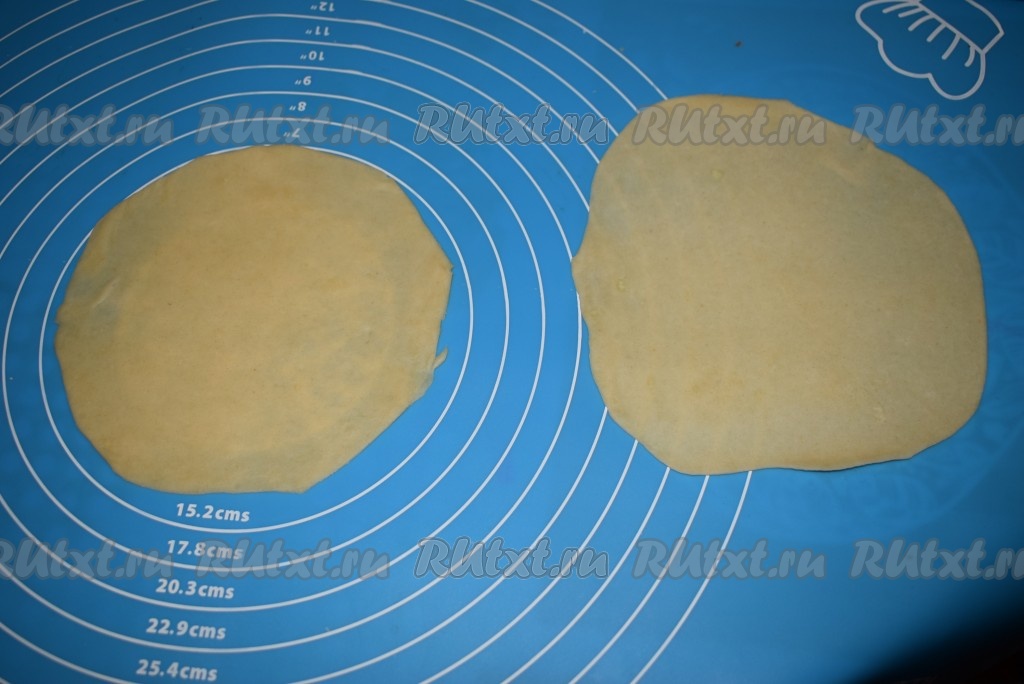 На столе, припылённом мукой (или на силиконовом коврике), раскатываем каждую половинку шарика в круг диаметром, приблизительно, 16 см. На одну пиццу-чебурек уйдет 2 таких кружка (в результате у нас получится 6 пицц-чебуреков).