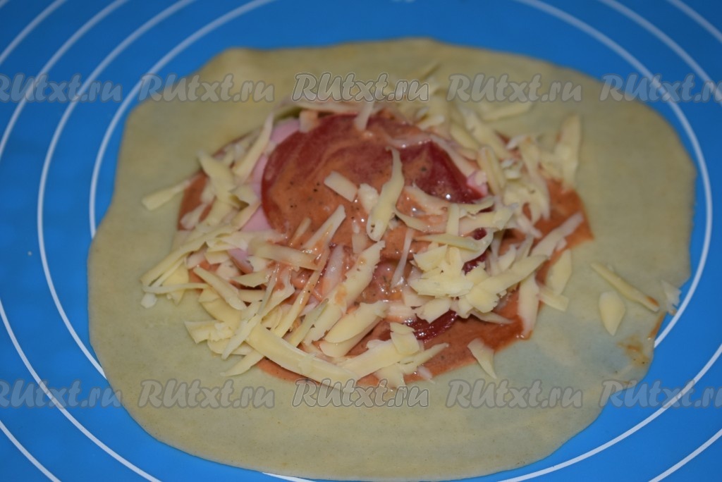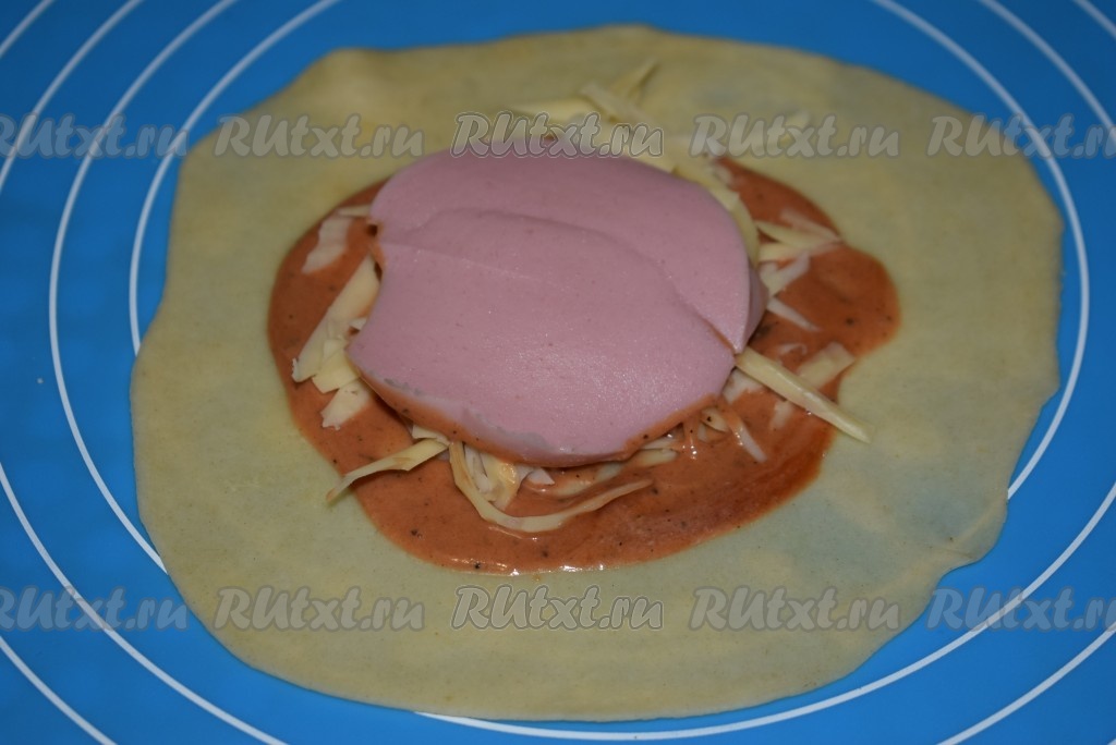 На один раскатанный кружок выкладываем 1 чайную ложку приготовленного соуса. Размазываем соус по поверхности теста, оставляя края чистыми. На соус насыпаем часть сыра. Поверх сыра выкладываем кружочек колбасы.
