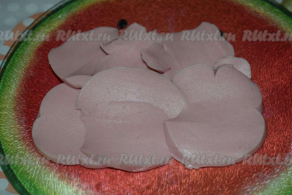 Колбасу нарежем на тонкие кружочки.