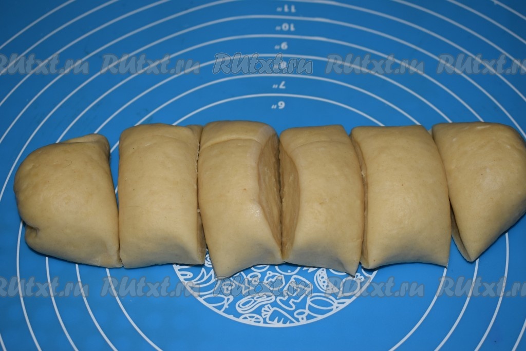 Приступим к лепке пицц-чебуреков. Достаём тесто. Отдохнувшее тесто станет очень мягким и податливым, с ним будет очень легко работать. Скатаем из теста колбаску, разрежем её на 6 равных частей.