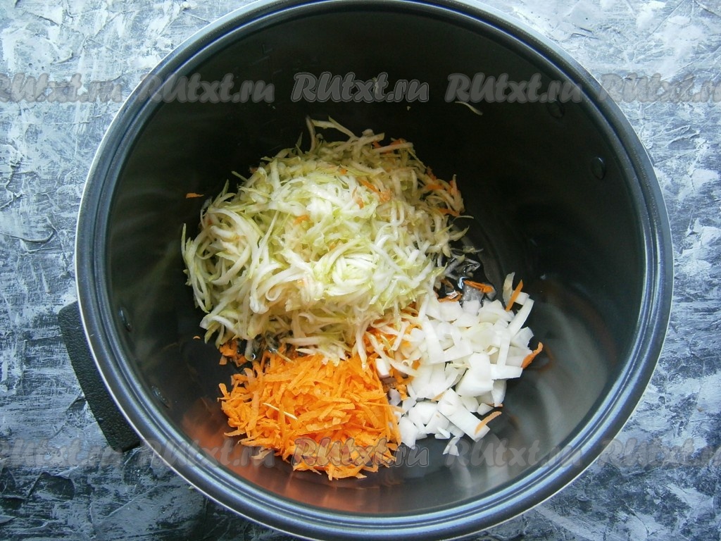 Лук, морковь и чеснок очистить. Если готовите молодые кабачки с маленькими семечками, то их можно не очищать от кожуры и семян. Морковь и кабачки натереть на крупной терке, лук нарезать небольшими кусочками. Растительное масло влить в чашу мультиварки, выложить кабачки, лук и морковь.