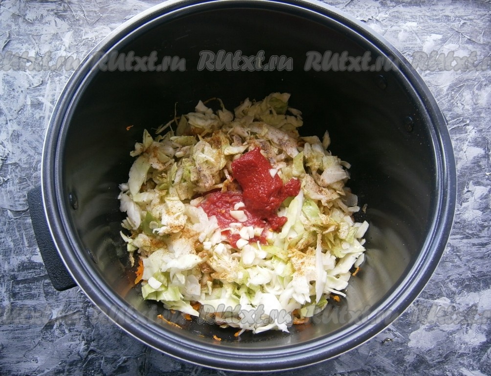 После сигнала добавить в чашу нашинкованную капусту, соль, специи, чёрный молотый перец, измельченный чеснок и томатную пасту, влить горячую воду (или бульон).