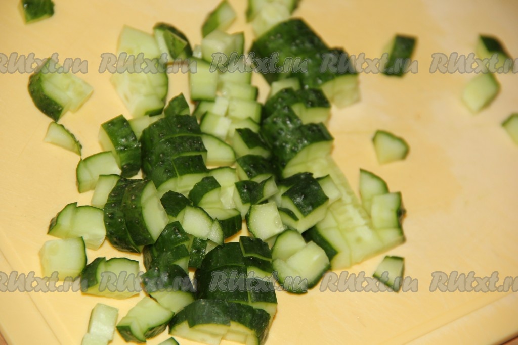 Огурчик вымыть и нарезать на кубики среднего размера.