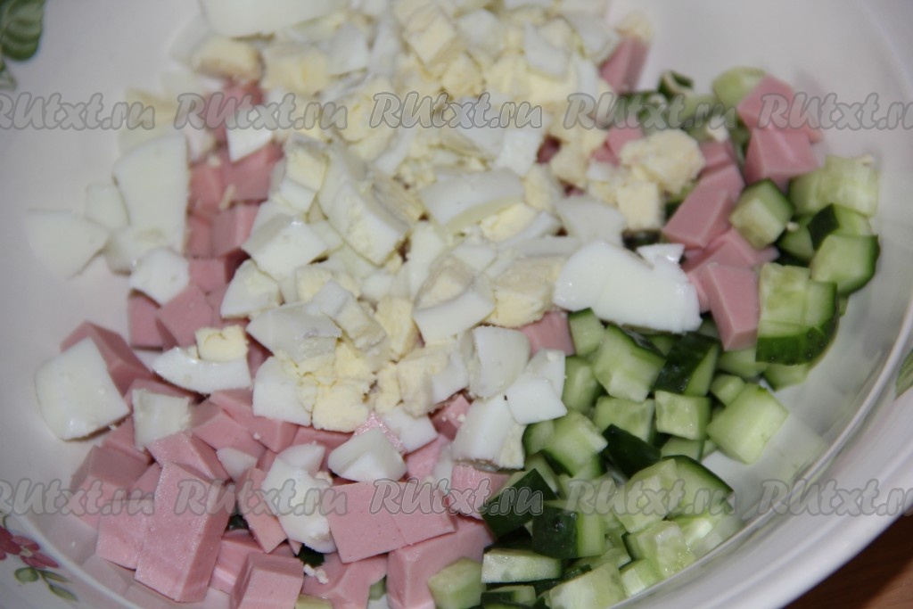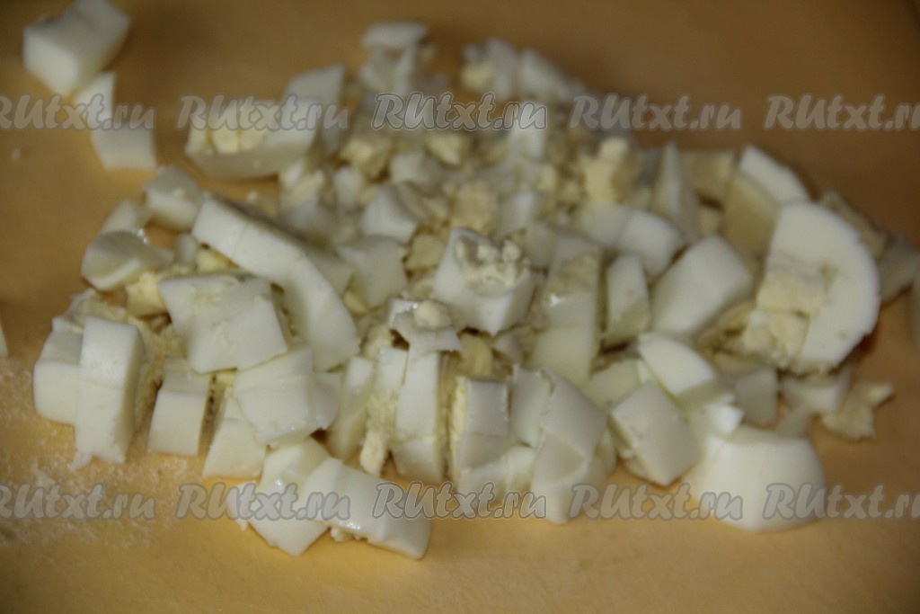 Яйца предварительно сварить (варить минут 10 с момента закипания воды), а затем остудить, очистить и мелко нарезать.