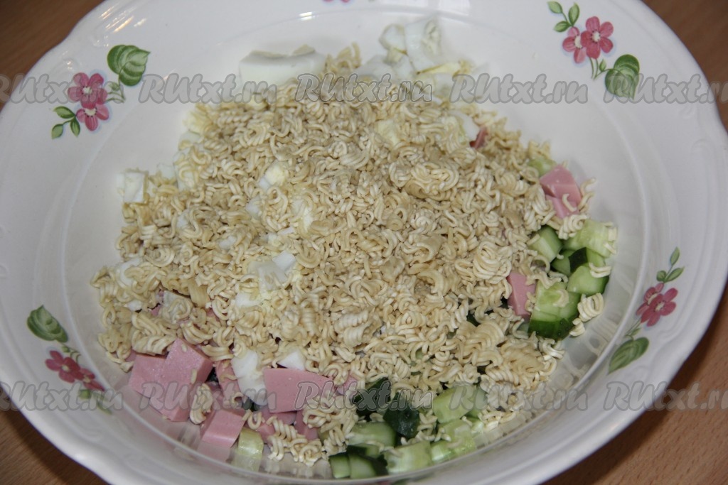 Лапшу "Роллтон" мелко поломать и добавить в салат из колбасы, огурцов и яиц. Предварительно отваривать или заливать кипятком лапшу быстрого приготовления "Роллтон" не нужно. Посолить салат по вкусу и перемешать.