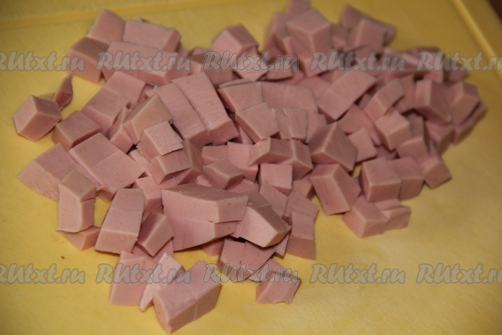 Колбасу тоже нарезать на средние кубики.