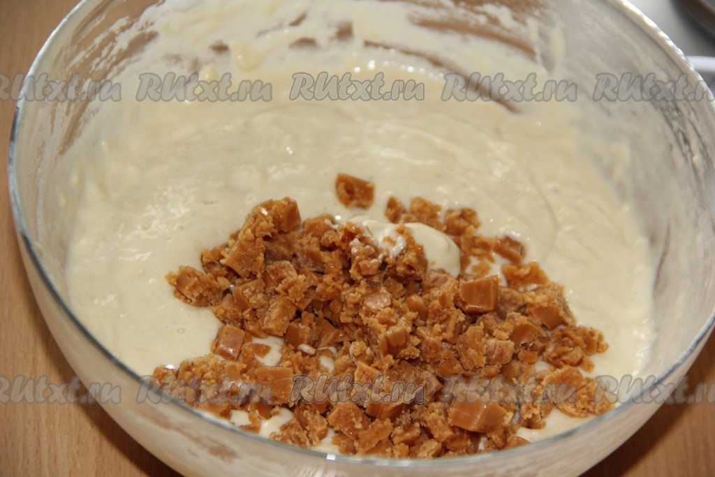 Ириски (если вы будете готовить с ними) нарезать на мелкие кубики и добавить в тесто.