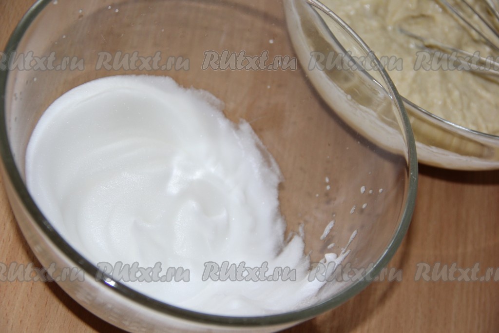 В отдельной сухой посуде взбить миксером яичный белок до стойких пиков.