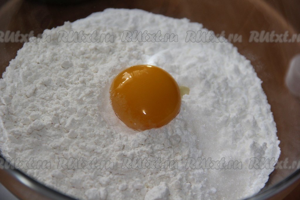 Аккуратно разделить яйцо на желток и белок. В смесь сухих ингредиентов добавить яичный желток.