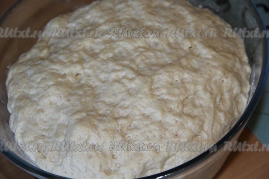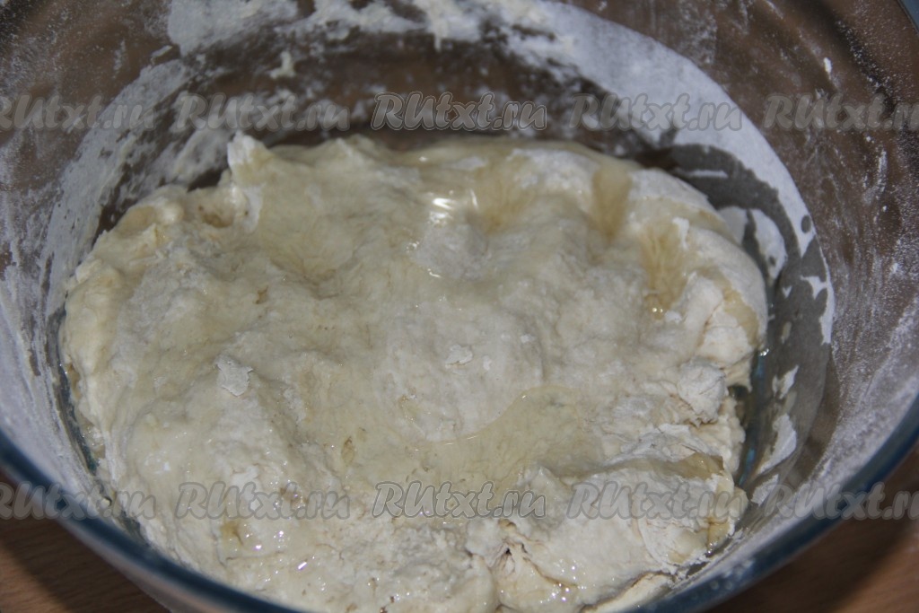 В конце замеса в липкое тесто влить 2 столовых ложки растительного масла, вмешать его, затем слегка смазать поверхность теста маслом. Оставить тесто в миске на 1 час в тёплом месте. Миску с тестом лучше прикрыть полотенцем, чтобы тесто не заветривалось.