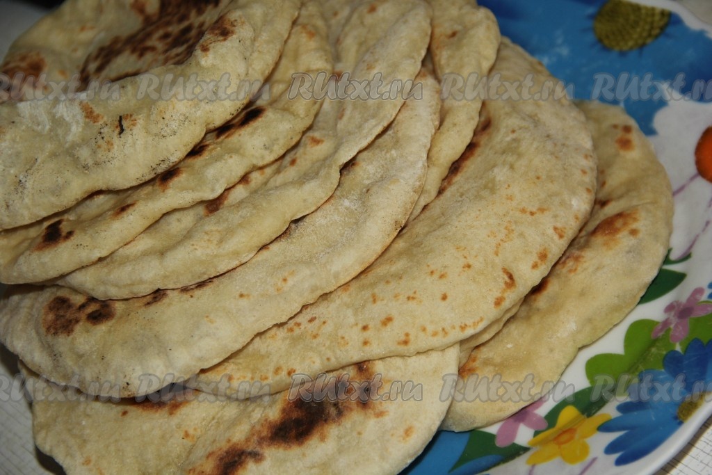 Переложить пышную лепёшку со сковороды на тарелку, примерно, через минуту она опадёт - это нормально. Аналогично раскатать и пожарить остальные лепёшки.